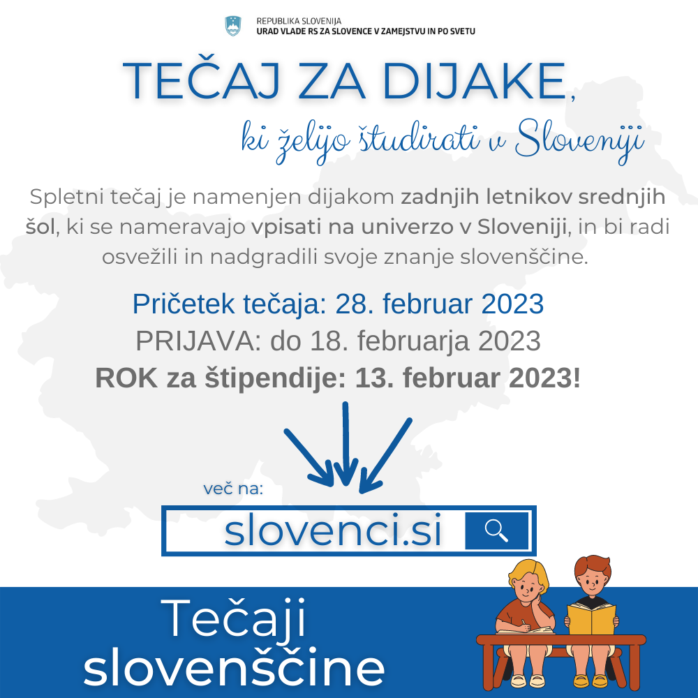 Viac informácií nájdete na nasledujúcom odkaze: https://slovenci.si/tecaj-slovenscine-za-dijake-ki-zelijo-studirati-v-sloveniji-februar-junij-2023/ [slovenci.si]